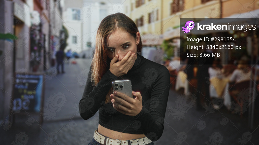 Woman holds smartphone and covers mouth with hand while reacting to a message at an outdoor street cafe, visible phone and surprised posture; surprise curiosity reaction. - Kraken Images