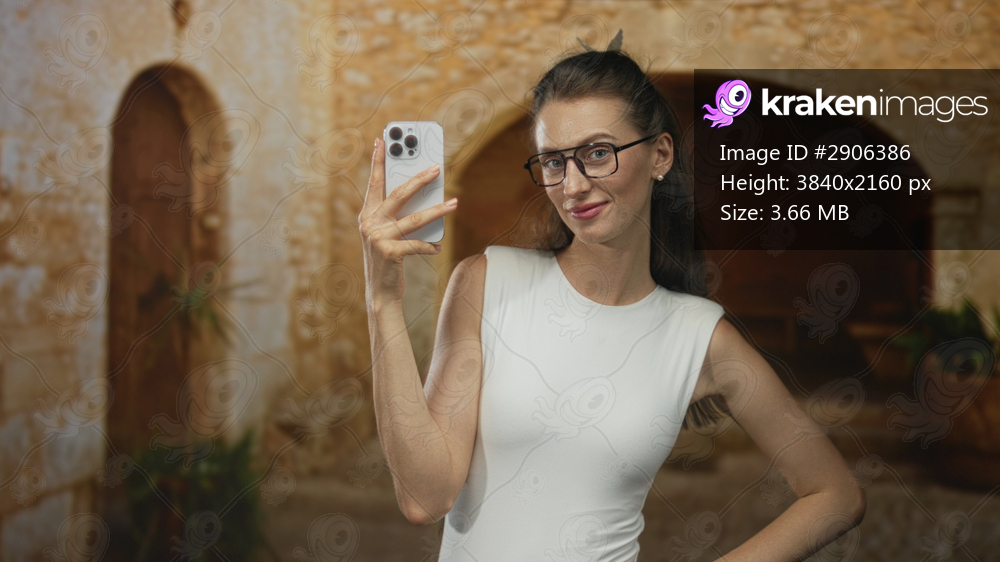 Woman holds smartphone for selfie on old town cobblestone street near stone archway and potted plants; confidence travel memory.