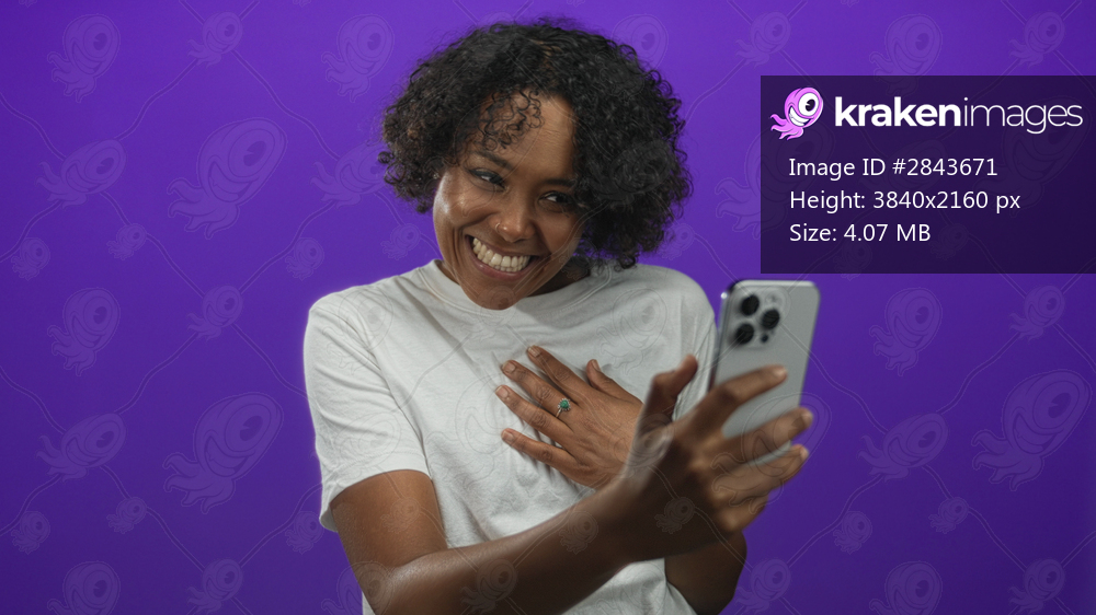 Woman holds smartphone with hand on chest broadly smiling at screen in purple studio setting; happiness.
