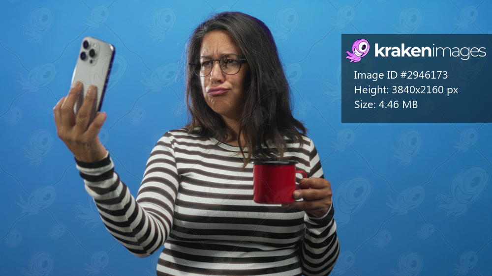 Woman holds smartphone in one hand and red mug in the other, hand raised to take a selfie in a studio with blue backdrop; amused connection.