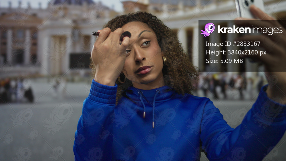 Woman holds smartphone and makeup brush to frame face in square wearing blue hoodie; self expression confidence.