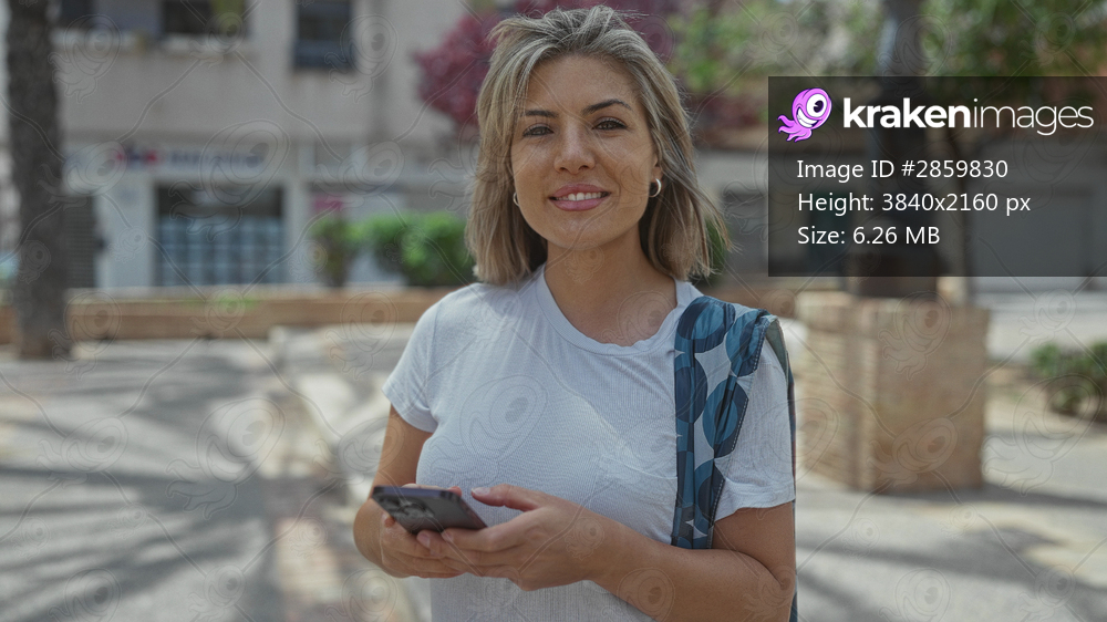 Woman holds smartphone on street scrolling through messages while carrying a patterned tote bag near a lamp post; connection.