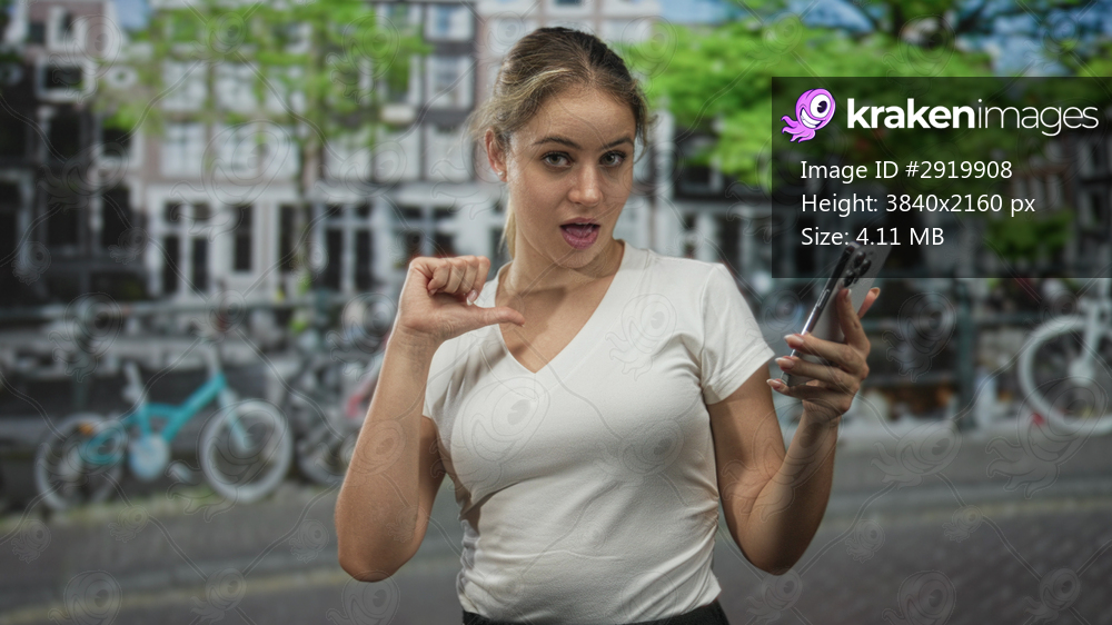 Woman holds smartphone and points thumb to chest while looking at camera on a city street in amsterdam; self confidence playful.