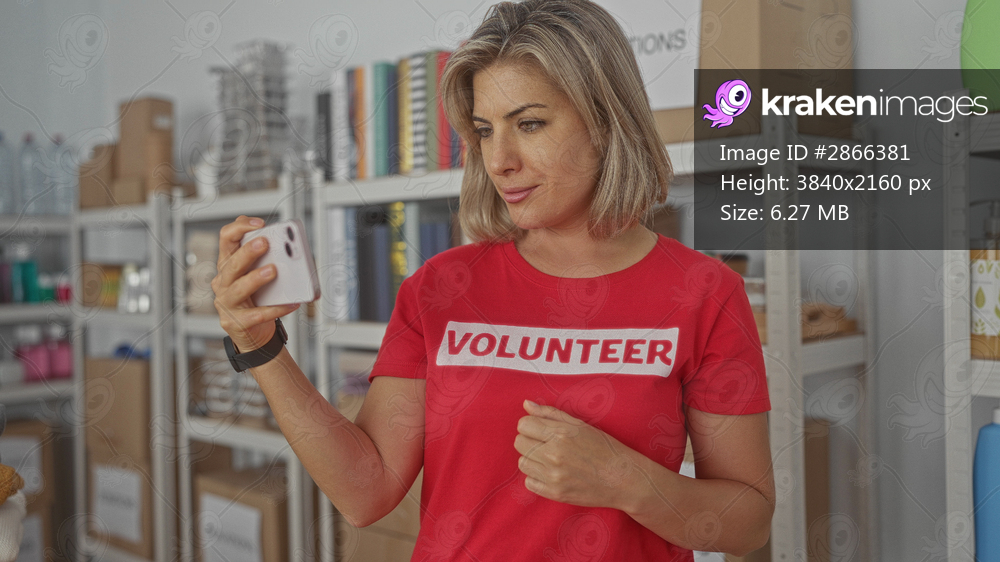 Woman holds smartphone and pumps fist in volunteer donation center room, surrounded by packed donations; community spirit service joy.