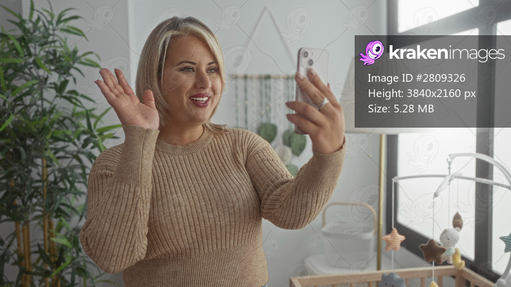 Woman holds smartphone and smiles beside baby crib mobile and potted plant under soft window light in bright bedroom; family bonding joy.