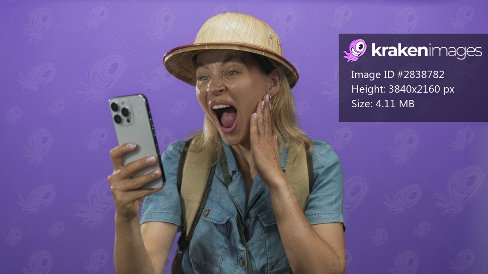 Woman holds smartphone and smiles eagerly in purple studio; travel adventure excitement discovery.