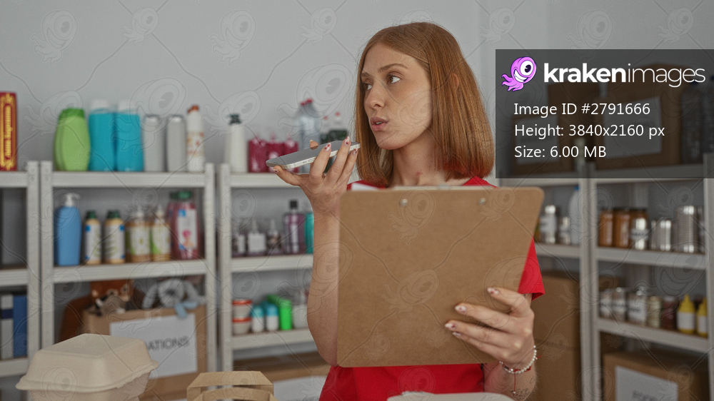 Woman holds smartphone speaking into it while reading clipboard in storeroom; communication focus dedication.