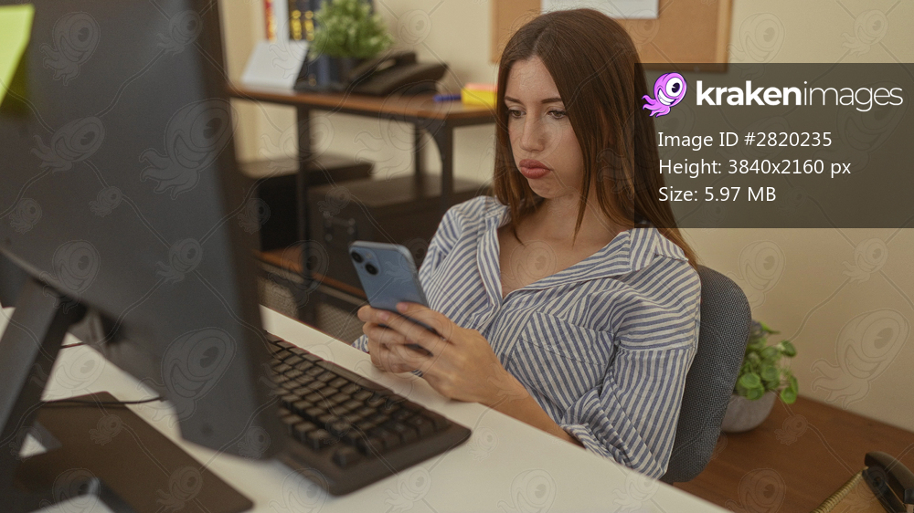 Woman holds smartphone and taps screen with hand in office building beside computer monitor; digital concentration.