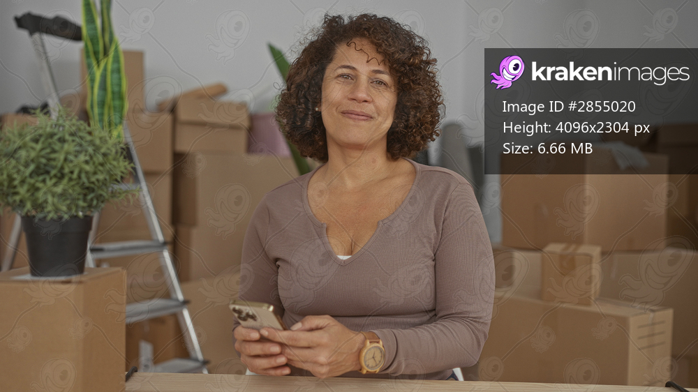 Woman holds smartphone texting inside building surrounded by moving boxes and a ladder; anticipation and hope.