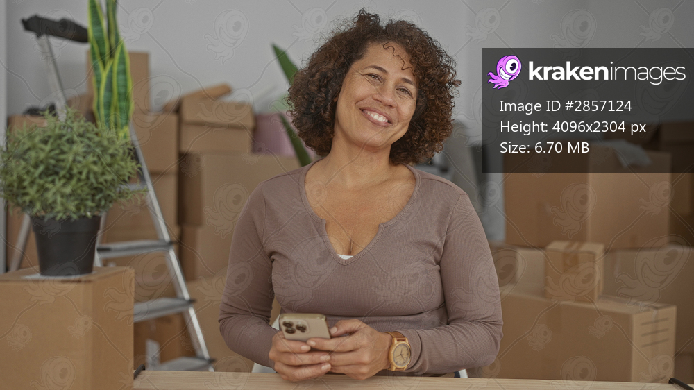 Woman holds smartphone texting inside building surrounded by moving boxes and a ladder; anticipation and hope.