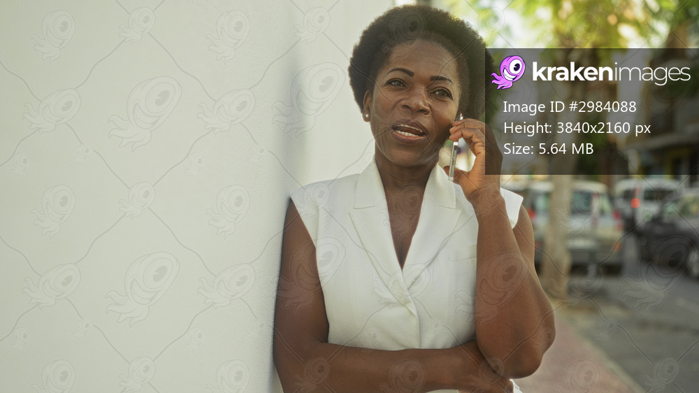 Woman holds smartphone to ear with arms crossed while leaning against white wall on an urban street; confidence connection.