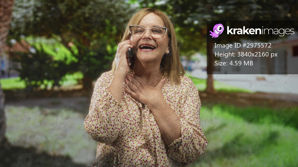 Woman holds smartphone to ear, hand on chest in building courtyard with trees and lawn; surprise news.