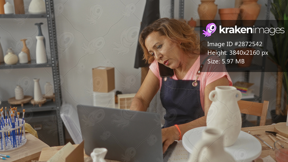Woman holds smartphone to ear in pottery studio while leaning over laptop and typing on keyboard; concentration focus productivity creativity.