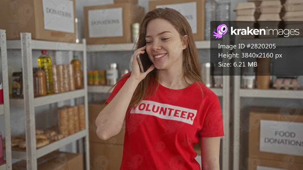 Woman holds smartphone to ear inside building beside donation shelves stocked with boxes and canned food around her; compassion and support.