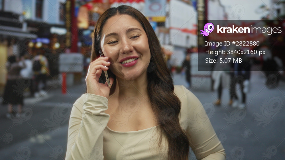 Woman holds smartphone to ear and smiles while talking on busy city street filled with shops and motion; happiness connection conversation cheer.