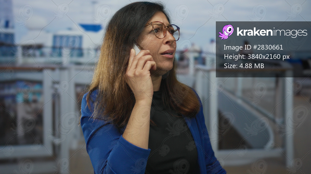 Woman holds smartphone to ear speaking on a cruise ship deck with glass railings and ocean in view; concern.