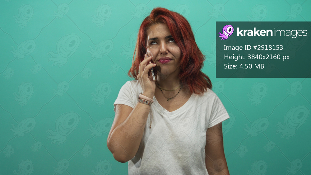 Woman holds smartphone to ear wearing white t shirt with red hair and gold necklace in teal studio; pensive.
