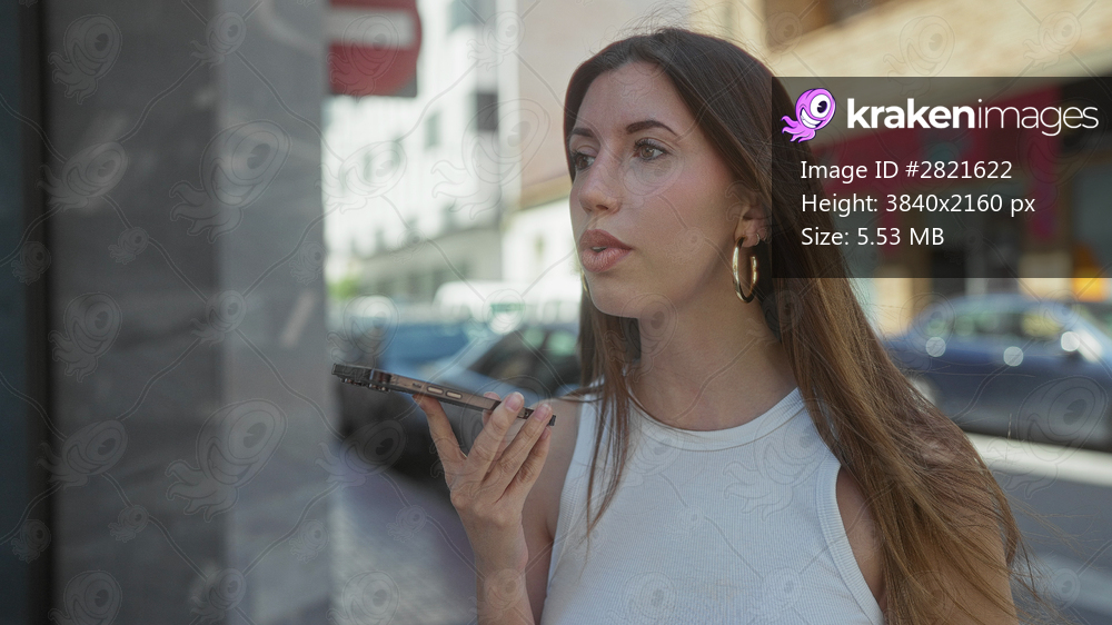 Woman holds smartphone to lips and leans forward while smiling and speaking on a bustling city street; confidence.