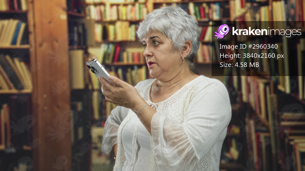 Woman holds smartphone up and speaks into it amid bookstore bookshelves inside a building; surprise discovery.
