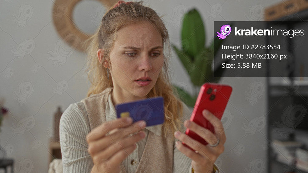 Woman holds smartphone while paying at home and blonde young influencer inserts card looking focused in an indoor interior scene.