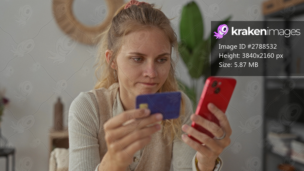 Woman holds smartphone while paying at home and blonde young influencer inserts card looking focused in an indoor interior scene.