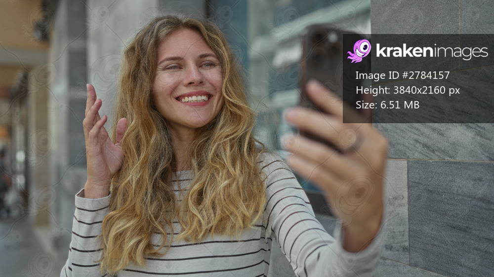 Woman holds smartphone while waving down a street before taking a selfie with a blonde young smiling kiss outdoor vibe.