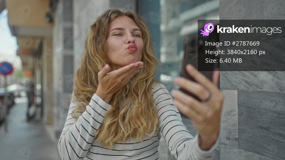Woman holds smartphone while waving down a street before taking a selfie with a blonde young smiling kiss outdoor vibe.