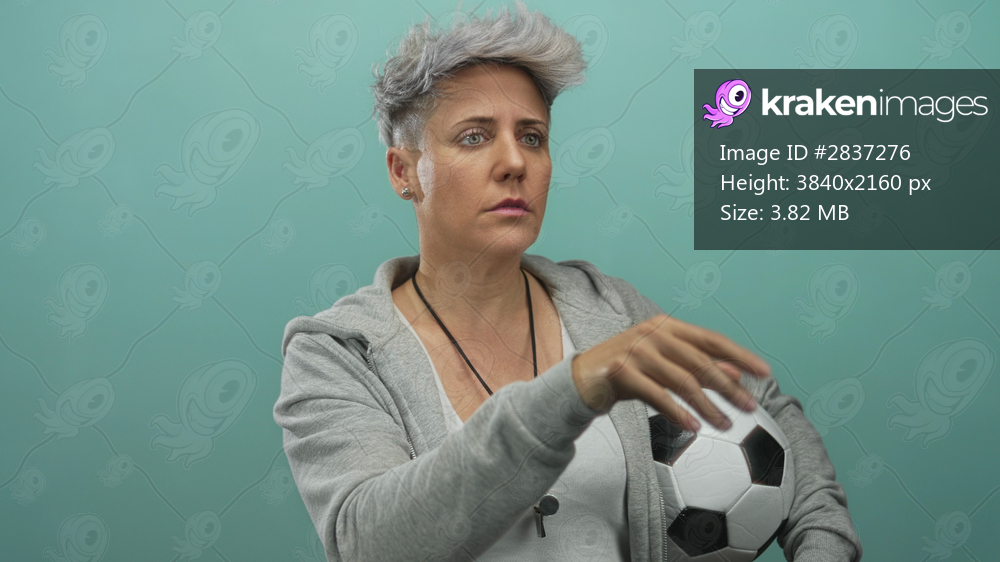 Woman holds soccerball under arm in studio with short hair and whistle; determination strength focus.