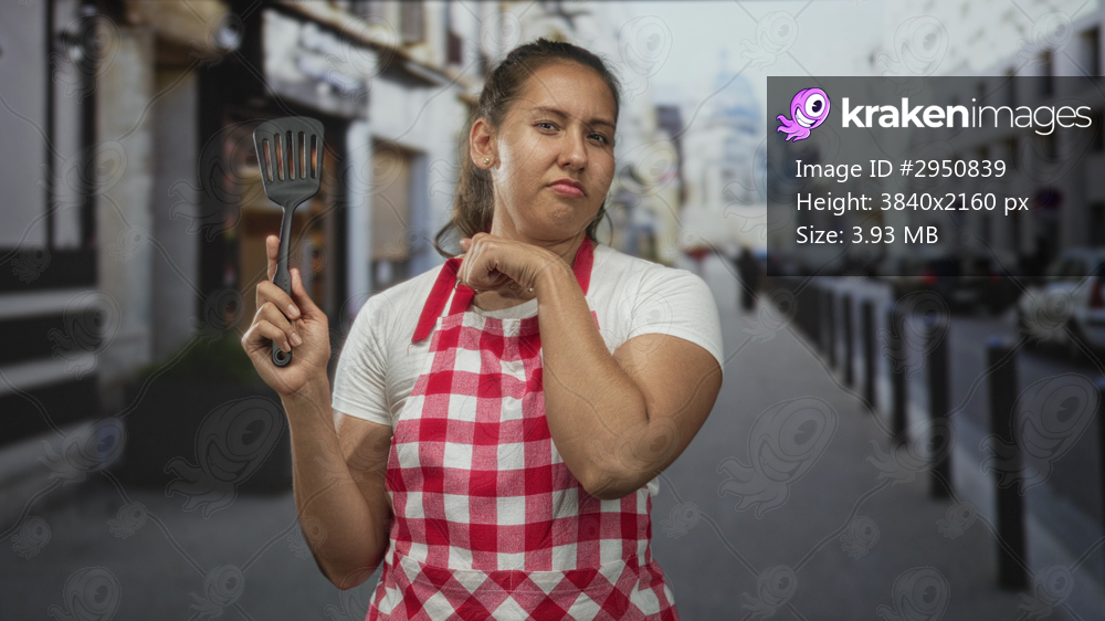 Woman holds spatula and points finger on a street wearing a red checkered apron and pouting expression; assertion defiance.