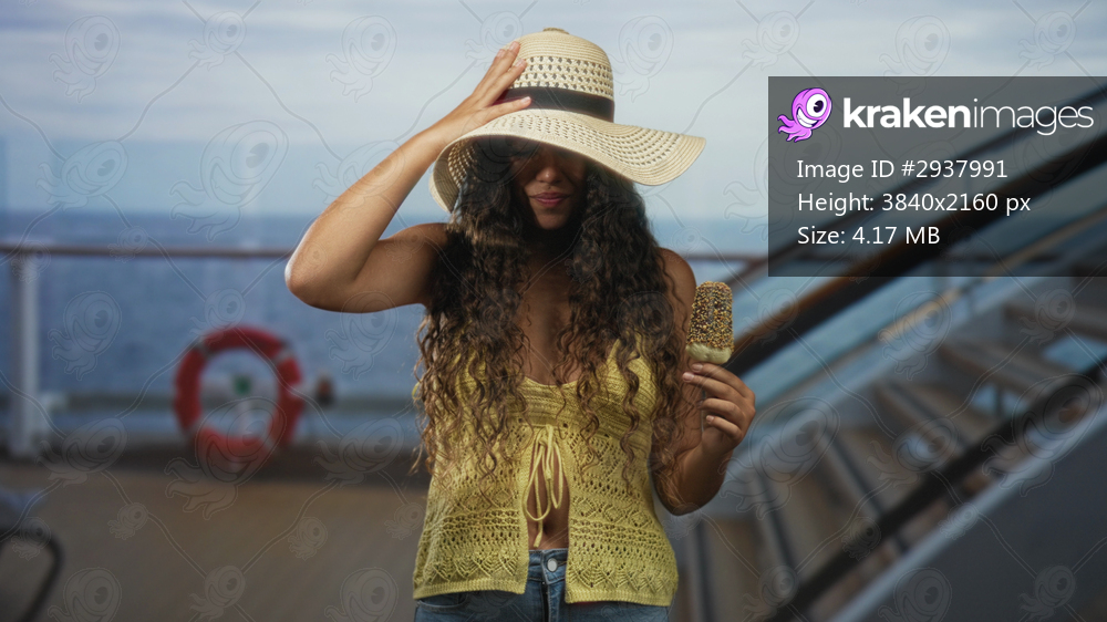 Woman holds sprinkles popsicle and lifts hand to hat on cruise ship deck near railing and lifebuoy; playful vacation.