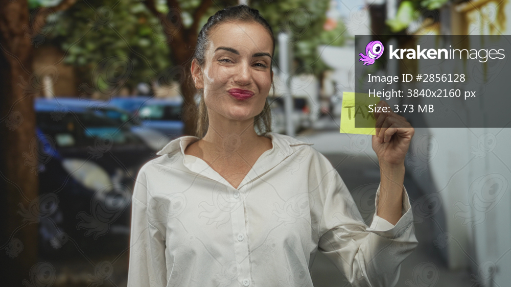 Woman holds sticky note reading tax in her raised hand while standing on a bustling urban street lined with parked cars; financial frustration.