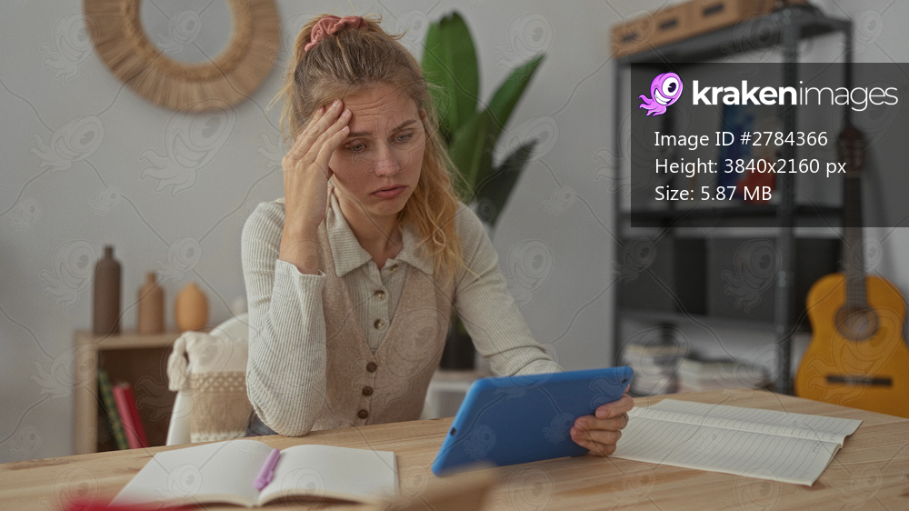 Woman holds tablet with anxious look at home and blonde young student pressing forehead over cluttered desk beside notebook while studying course material. - Kraken Images
