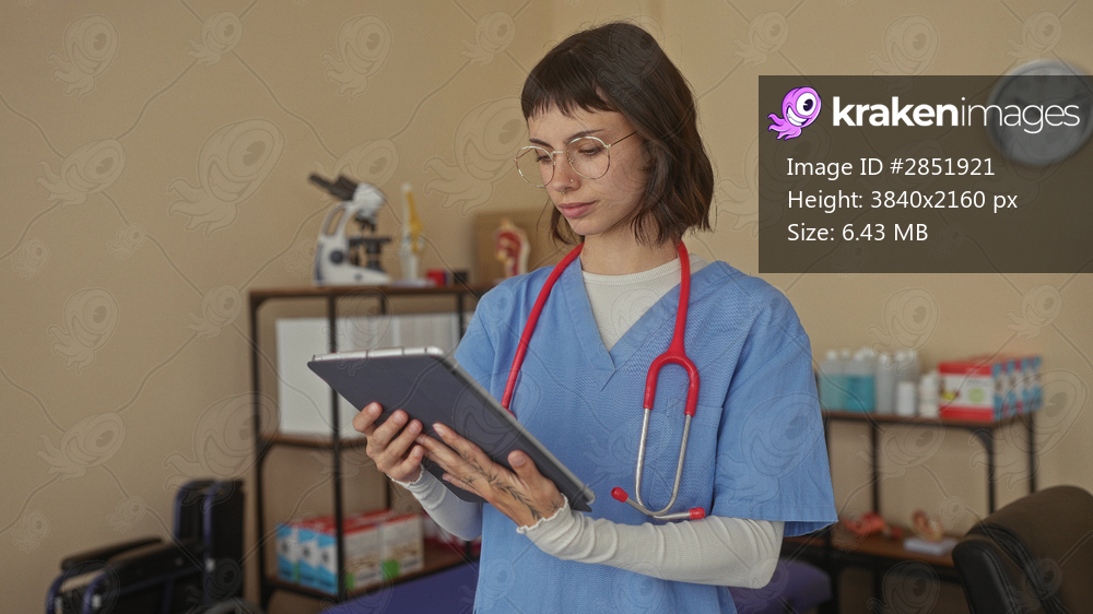 Woman holds tablet computer close to chest in medical office building reviewing patient data; compassion.