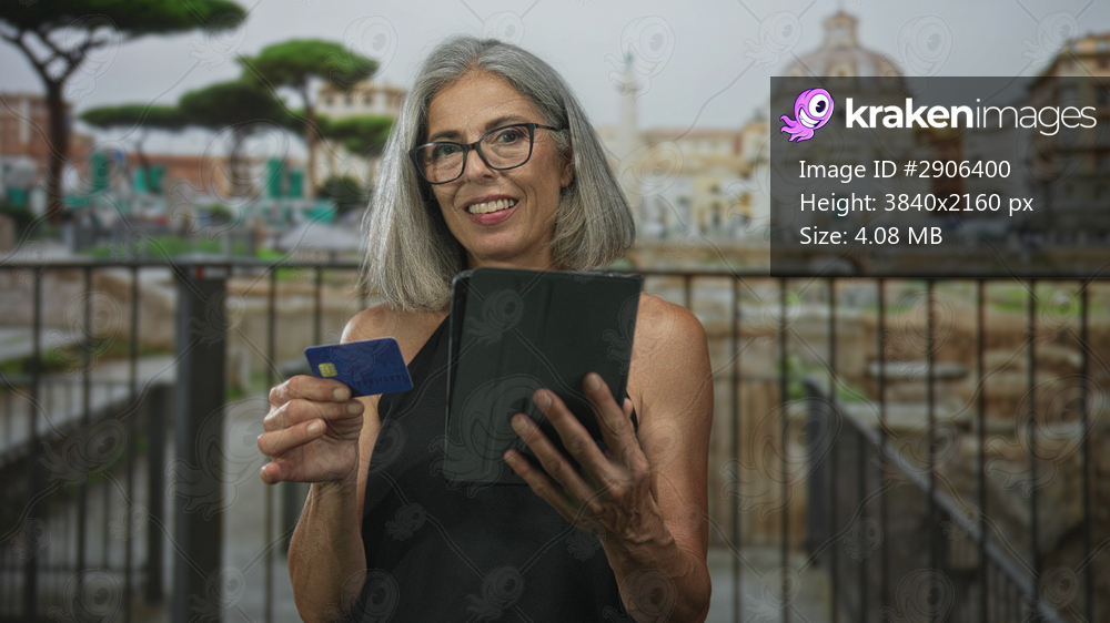Woman holds tablet and creditcard at ruins, smiling and reading screen while showing hands; serenity.