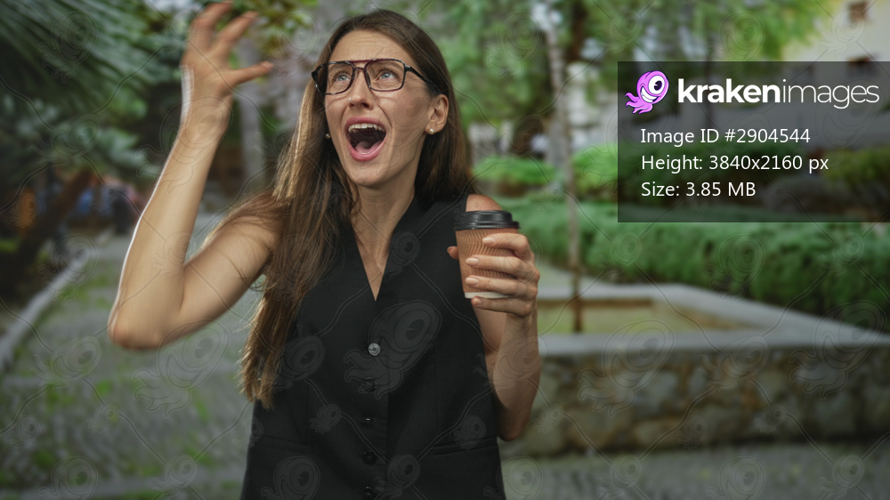Woman holds takeaway coffee cup and presses hand to head on street while wearing glasses with open mouth expression; frustration.