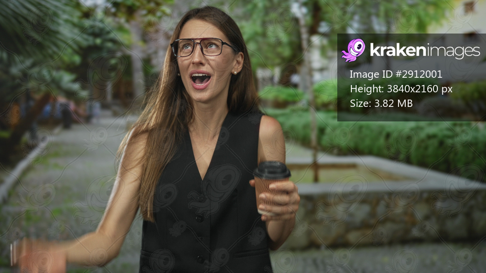 Woman holds takeaway coffee cup and presses hand to head on street while wearing glasses with open mouth expression; frustration.