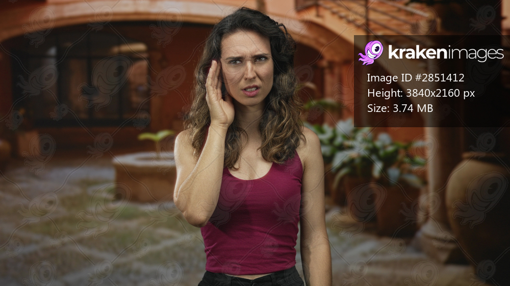 Woman holds temple with a painful gesture beneath stone arches inside a sunlit building courtyard; discomfort.