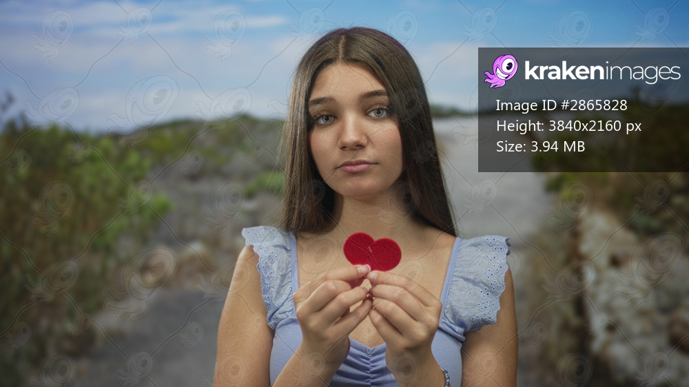 Woman holds torn red paper heart with both hands in forest clearing beneath leafy canopy; heartbreak melancholy.