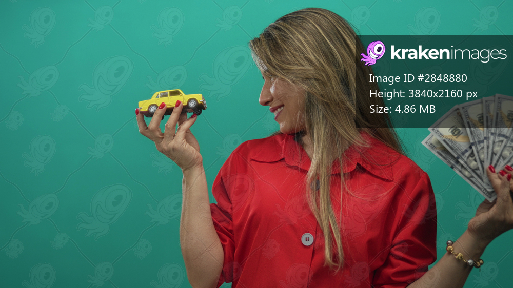 Woman holds toy car in one hand and fan of cash in other hand in studio; investment choice confidence.