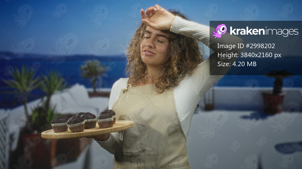 Woman holds tray of chocolate muffins, hand on forehead in building, squinting from bright sun; baking tired warmth.