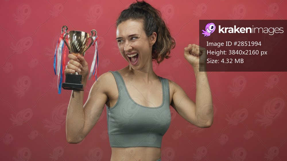 Woman holds trophy with fist raised in studio against a vivid red backdrop, smiling broadly; pride celebration.