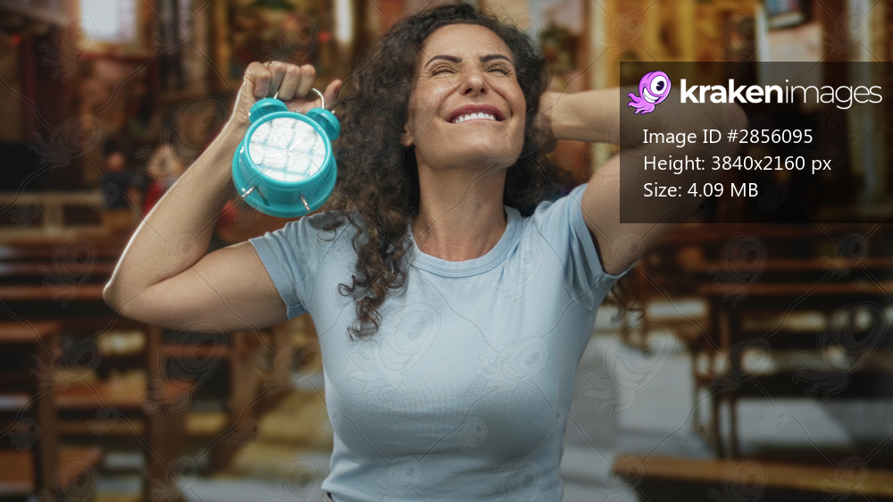 Woman holds turquoise alarm clock to her temple inside church pews beside stone columns near wooden altar; contemplation patience devotion serenity.
