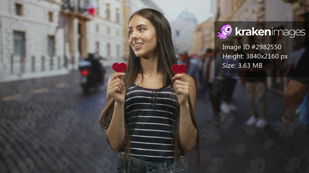 Woman holds two small red heart props with both hands on a cobbled city street, smiling and posing amid blurred pedestrians; romance.