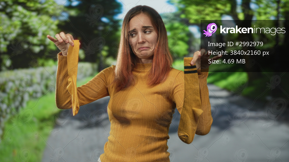 Woman holds two yellow socks at arms length with wrinkled nose in forest; laundry frustration disgust.