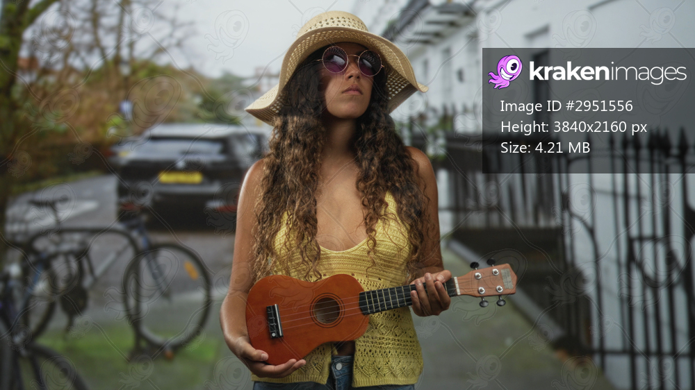 Woman holds ukulele at waist on a residential street, wearing straw sun hat and round sunglasses with neutral expression; pensive solitude.