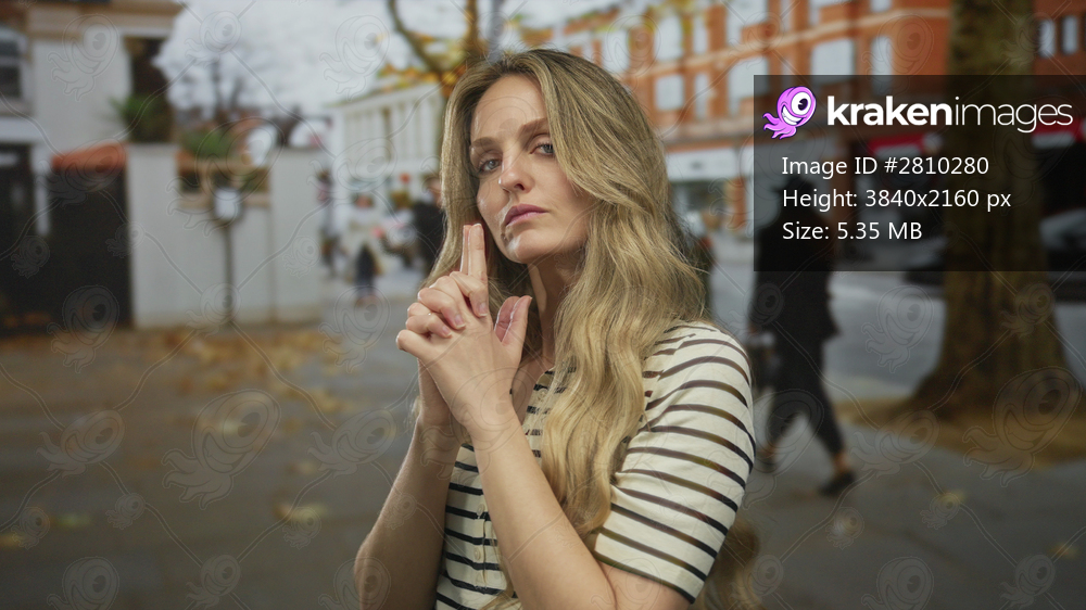 Woman holds up hand in a gesture on a busy street where young blonde figure appears outdoors in an urban setting with a confident portrait look.