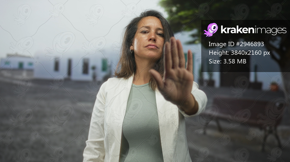 Woman holds up hand palm forward for stop in street in front of white building and bench; defiance protection.