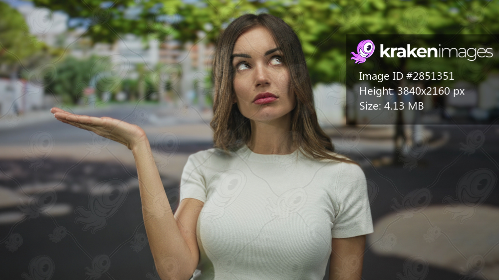 Woman holds up hand palm up near face in bright city street beside blurred trees and parked cars; uncertainty.