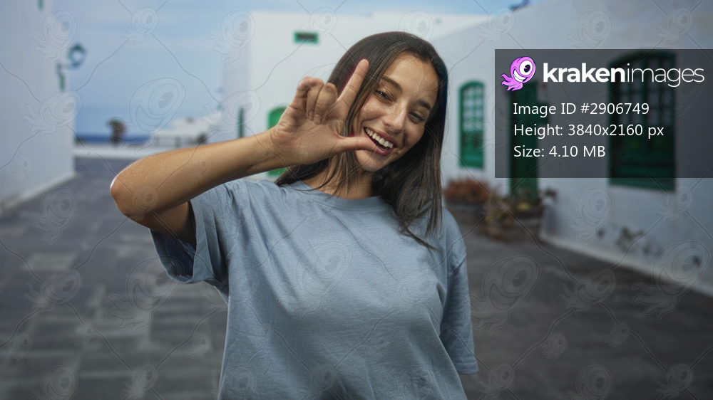 Woman holds up pinky and smiles on a street with white buildings by the sea, wearing a blue t shirt; joy travel moment.