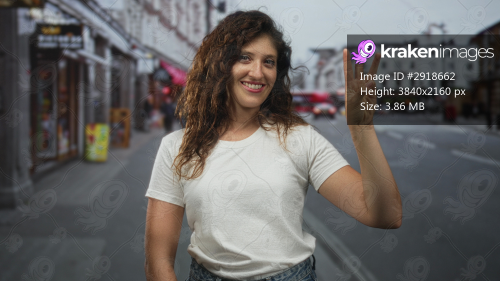 Woman holds up three fingers with smiling face wearing white tshirt and denim jeans on a busy street in the city; happiness confidence.